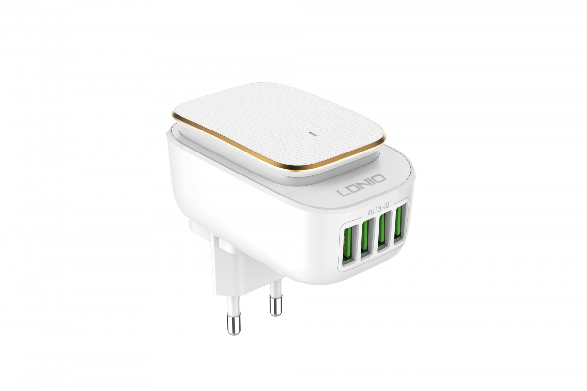LDNIO A4405/ Сетевое ЗУ + Led светил. 2.4W + Кабель Micro/ 4 USB Auto-ID/ Выход: 22W/ White&Gold