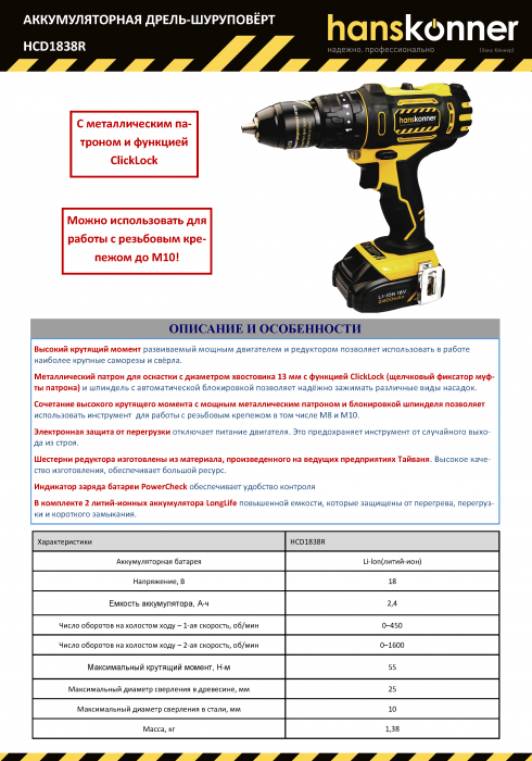Аккумуляторный шуруповерт Hanskonner HCD1838R