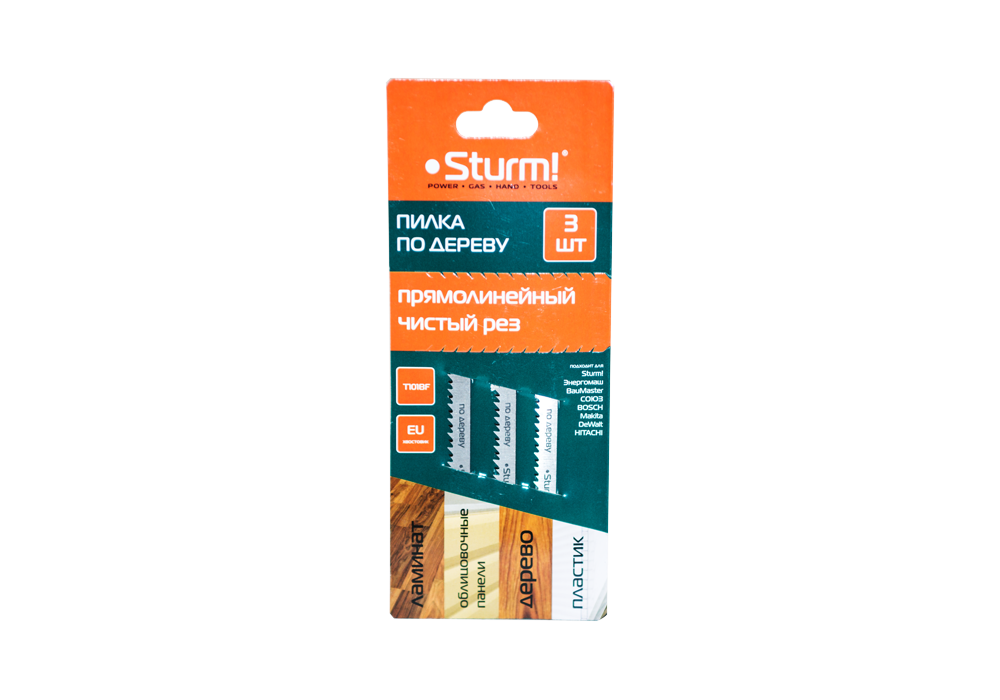 Особенности: 1. Автоматическая заточка и шлифовка зубьев обеспечивают их правильную геометрию. 2. Изготавливаются из хромованадиевой, быстрорежущей стали. 3. Полотна "STURM!" имеют европейский (EU) хвостовик, что позволяет их использовать для электролобзиков торговых марок STURM!, Энергомаш, Союз, Baumaster, AEG, Bosch, Hitachi, Makita, Metabo. 4. Новейшая технология производства полотен обеспечивает улучшенные качества материала, точный рез и быструю работу.