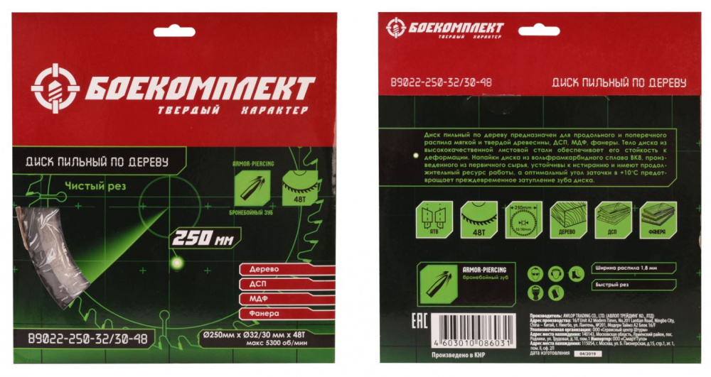 Диск пильный БОЕКОМПЛЕКТ B9022-250-32/30-48