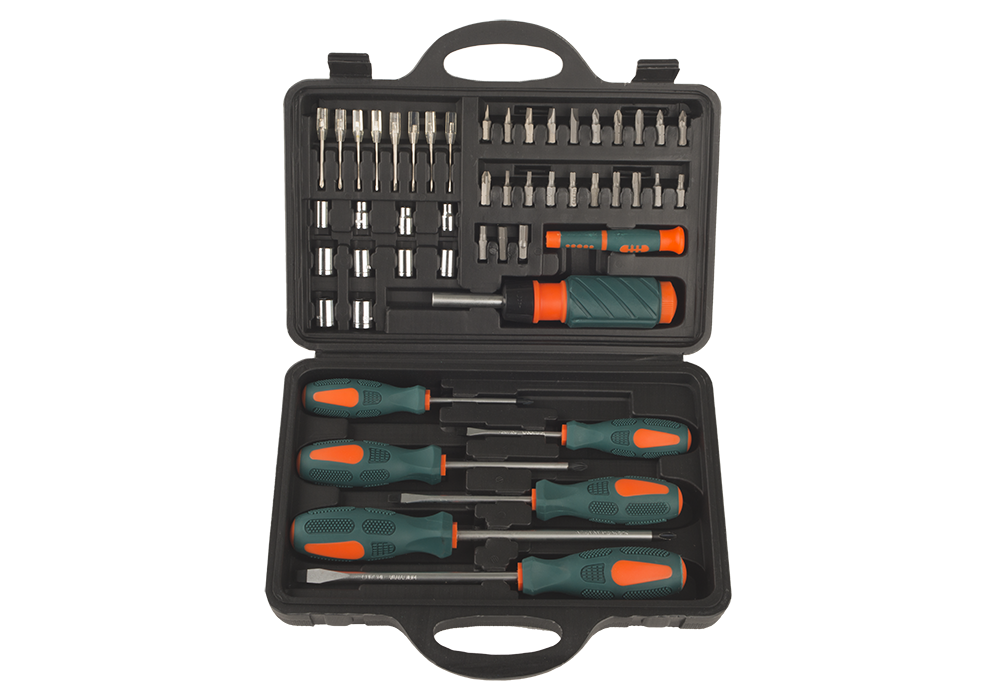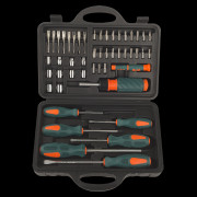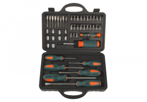 Комплектация: В прочном и удобном пластиковом кейсе: отвертки SL5x75, SL6x100, SL8x150; PH1x75, PH2x100, PH3x150; Держатель с храповиком; Мини ручка, Адаптер, Отвёртки для точной механики: SL1.6x35, SL2.0x35, SL2.4x35, SL3.0x35 мм; PH1.6x35, PH2.0x35, PH2.4x35, PH3.0x35 мм; Торцевые головки: 4.5.6.7.8.9.10.11.12.13 мм; 22 биты: SL3, SL4, SL5, SL6, SL7; PH1, PH2, PH3; PZ1, PZ2, PZ3; TORX: Т10, Т15, Т20, Т25, Т27, Т30, Т40; HEX3, HEX4, HEX5, HEX6