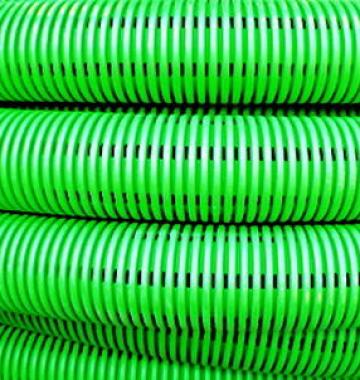Наша компания реализует Труба гибкая одностенная дренажная д.110мм с геофильтром, класс SN4, перфорация 360 град., цвет зеленый (141911-4K) оптом со склада, по минимальным ценам от завода изготовителя.
