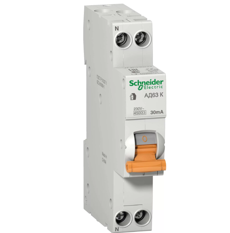 Наименование товара: Выключатель автоматический дифференциального тока 2п (1P+N) C 20А 30мА тип AC 4.5кА К АД63 Домовой SchE 12523