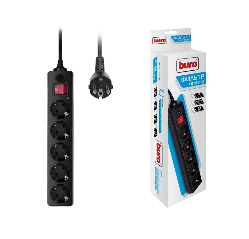 Наша компания реализует Удлинитель с сетевым фильтром 5х3м с заземл. 10А IP20 500SH-3-B CCA 3х0.75 черн. BURO 992293 оптом со склада, по минимальным ценам от завода изготовителя.