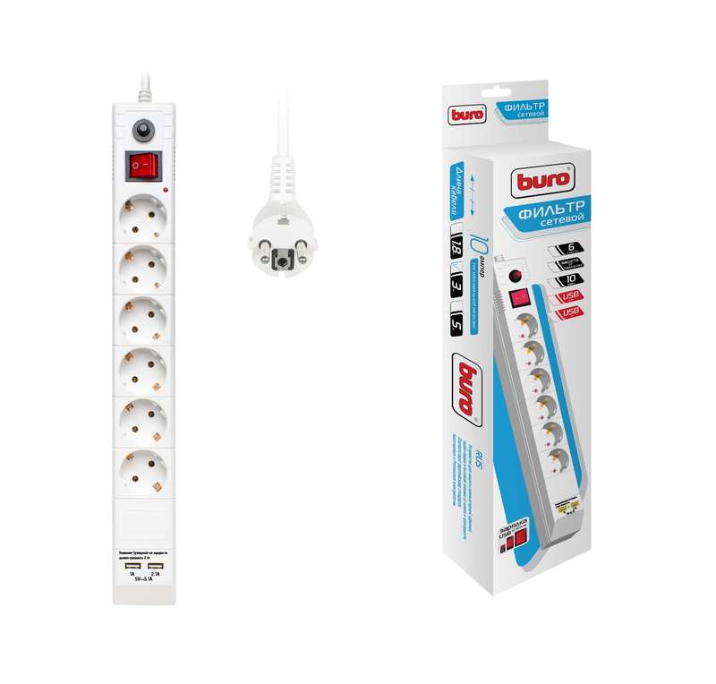 Наша компания реализует Удлинитель с сетевым фильтром 6х3м с заземл. 10А IP20 BU-SP3_USB_2A-W CCA 3х0.75 бел. BURO 992311 оптом со склада, по минимальным ценам от завода изготовителя.