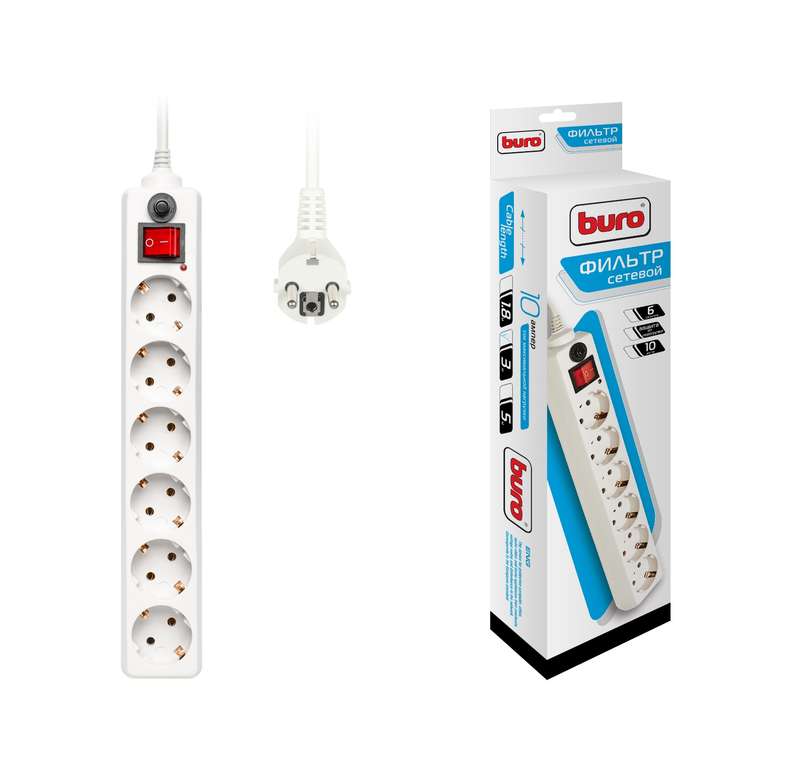 Наша компания реализует Удлинитель с сетевым фильтром 6х3м с заземл. 10А IP20 600SH-3-W CCA 3х0.75 бел. BURO 992266 оптом со склада, по минимальным ценам от завода изготовителя.