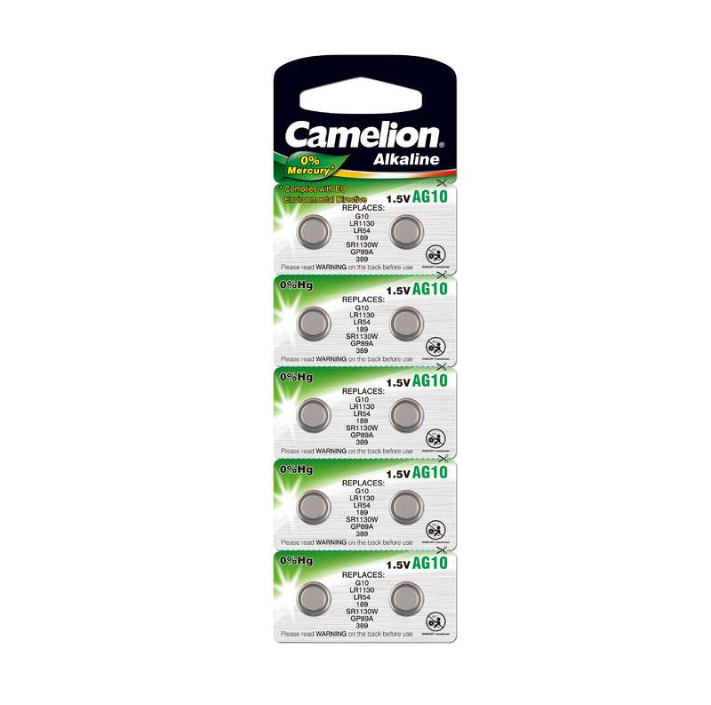 Элемент питания алкалиновый "таблетка" G10 Mercury Free AG10-BP0%Hg 389A/LR1130/189 BL-10 (блист.10шт) Camelion 12818