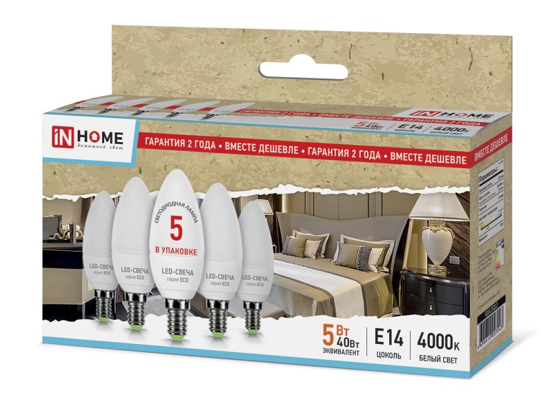 Как купить Лампа светодиодная LED-СВЕЧА-ECO 5Вт 230В Е14 4000К 375Лм (5шт в упаковке) IN HOME (цена за уп) в Ростове-на-Дону или Краснодаре