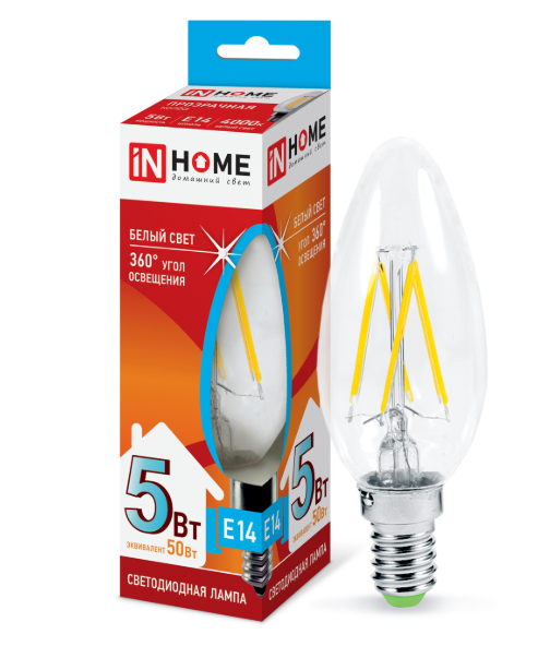 В интернет магазине компании ООО «Все для электромонтажа» на Главной странице вы можете перейти на страницу Каталог и выбрать категорию товара Источники света (лампы) там вы найдете вкладку подкатегории Лампы филаментовые где нужно выбрать Лампы филаментовые в которой находится нужный вам товар Лампа светодиодная LED-СВЕЧА-deco 5Вт 230В Е14 4000К 450Лм прозрачная IN HOME.