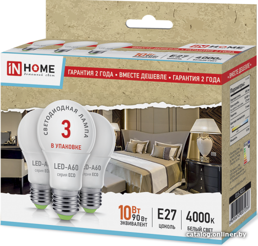 Лампа светодиодная LED-A60-ECO 10Вт 230В Е27 4000К 800Лм (3шт в упаковке) IN HOME (цена за уп)