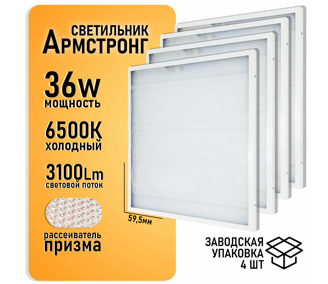 Этот светильник из серии LED отличается корпусом из стали белого цвета и матовым молочным плафоном из полистирола, который обеспечивает мягкое и нейтральное освещение благодаря призматическому рассеивателю. Его габариты составляют 595 на 595 мм при минимальной толщине всего 1,9 см, а масса — 0,9 кг. Встроенные светодиоды с интегрированным цоколем служат источником света, а сама лампа входит в комплект. Корпус устройства надежно защищён от пыли и влаги по стандарту IP40 и рассчитан на длительный срок работы — до 50 000 часов. Такое освещение идеально подходит для офисных пространств, рабочих зон и кухонь.