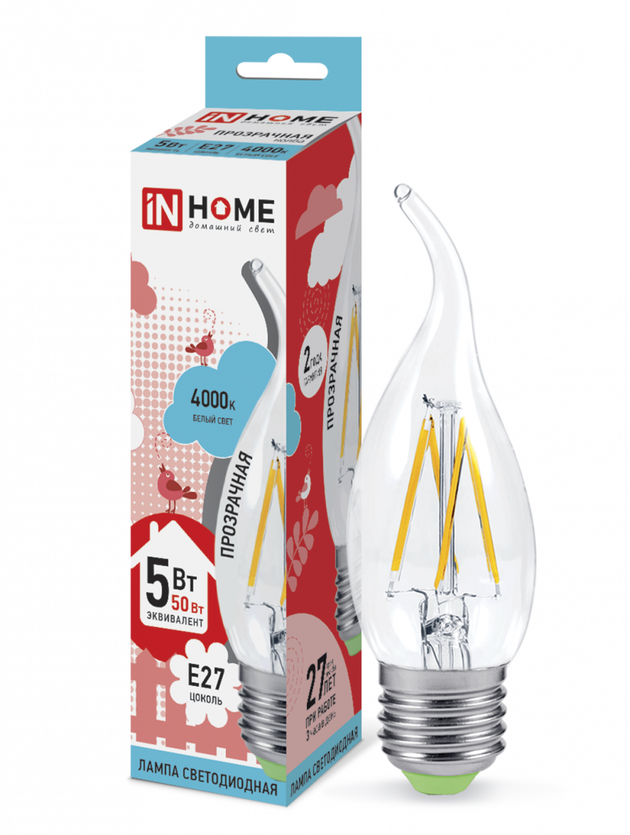 В интернет магазине компании ООО «Все для электромонтажа» на Главной странице вы можете перейти на страницу Каталог и выбрать категорию товара Источники света (лампы) там вы найдете вкладку подкатегории Лампы филаментовые где нужно выбрать Лампы филаментовые в которой находится нужный вам товар Лампа светодиодная LED-СВЕЧА НА ВЕТРУ-deco 5Вт 230В Е27 4000К 450Лм прозрачная IN HOME*.