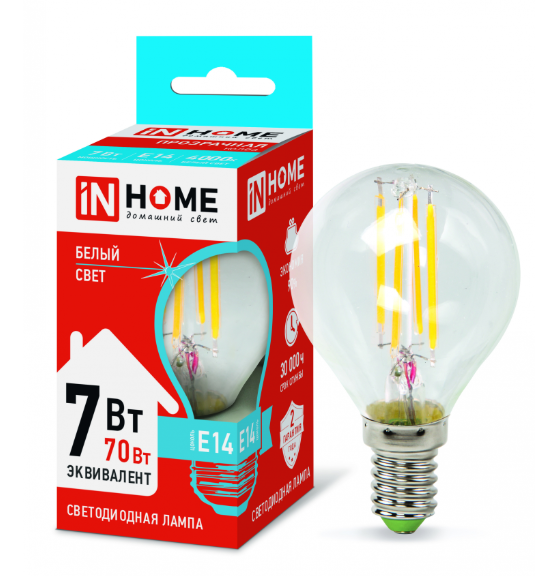 В интернет магазине компании ООО «Все для электромонтажа» на Главной странице вы можете перейти на страницу Каталог и выбрать категорию товара Источники света (лампы) там вы найдете вкладку подкатегории Лампы филаментовые где нужно выбрать Лампы филаментовые в которой находится нужный вам товар Лампа светодиодная LED-ШАР-deco 7Вт 230В Е14 4000К 630Лм прозрачная IN HOME*.