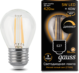 Лампа Gauss LED Filament Globe dimmable E27 5W 2700K 1/10/50