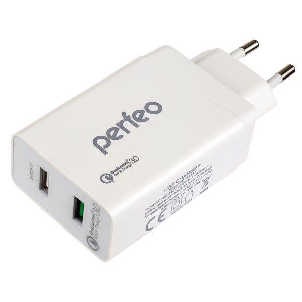 PERFEO Сетевое зарядное устройство с разъемом 2xUSB, QC3.0, белый, "FAST 2" (PF_A4141)