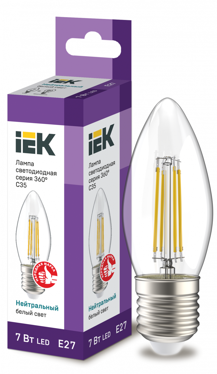 Лампа светодиодная C35 свеча прозрачная 7Вт 230В 4000К E27 серия 360° IEK