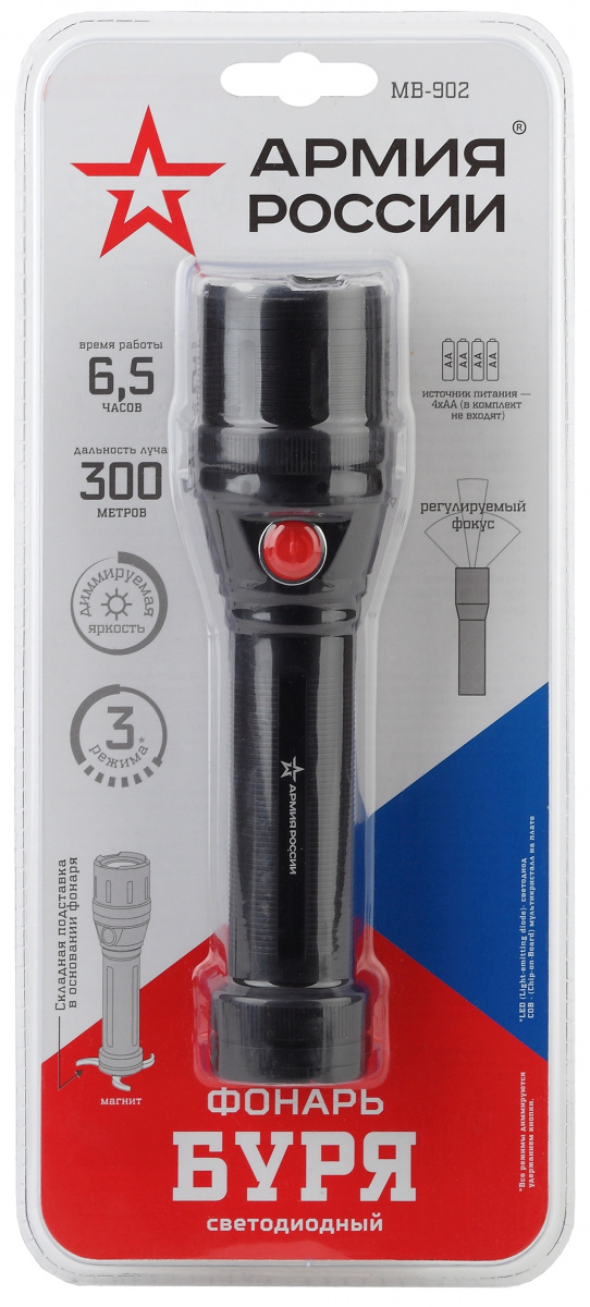 Наша компания реализует MB-902 Фонари АР АРМИЯ РОССИИ универс. Буря [5Вт LED + COB светильник, алюм, рег фокус, диммер, 4xAA оптом со склада, по минимальным ценам от завода изготовителя.