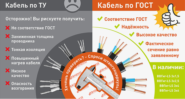 Покупка кабелей, произведённых по техническим условиям (ТУ) без привязки к стандартам ГОСТ, не является оптимальным решением. В случае отсутствия кабеля, соответствующего ГОСТ, стоит обратить внимание на изделия по ТУ, но с сечением, значительно превышающим требуемое по расчетам. К примеру, если требуется кабель ВВГ 3х1,5 мм², разумнее выбрать вариант ВВГ 3х2,5 мм² для обеспечения надежности.